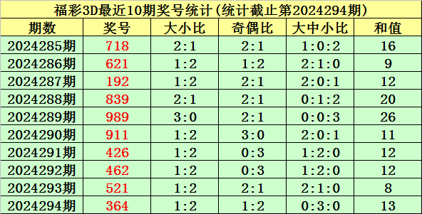 开奖回顾:福彩3D第2024294期奖号为:364。奖号类型为组六,和值为13,奇偶比为1:2,跨度为3,012路比为2:1:0,大小比为1:2。