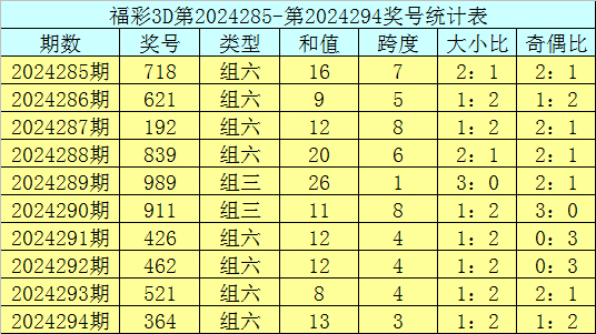 类型判断:上期奖号为364。号码3近10期开出2次,走势较冷,号码4出现3次,走冷,号码6出现4次,走势较冷,上期总体遗漏走温,本期预计奖号以热码为主。