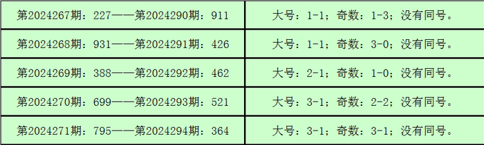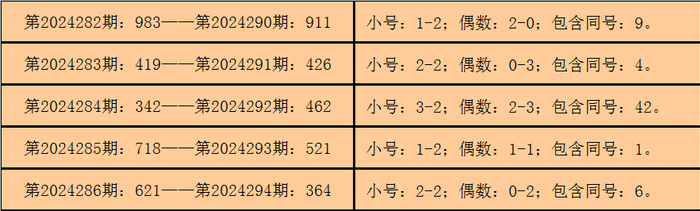 所以,3D第2024287期开出奖号:192,其大小比为1:2,奇偶比为2:1,012路比为1:1:1,与3D第2024295期奖号可能有同号。