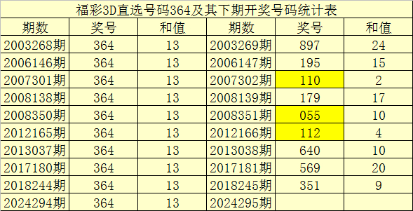一、开奖回顾:第2024294期福彩3D奖号为364。奖号奇偶比为1:2,和值为:13,跨度为:3。