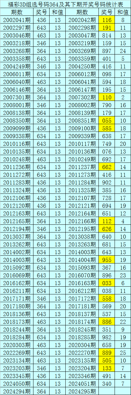 二、组选分析:历史上组选号码364开出了49次,其下期奖号分别为:116-191-814-159-897-401-416-098-594-195-110-790-179-055-585-638-749-076-692-662-416-902-385-728-694-651-112-626-640-681-643-955-367-896-033-038-558-569-537-886-351-982-658-889-505-133-491-340,其开出期数和下期奖号统计为: