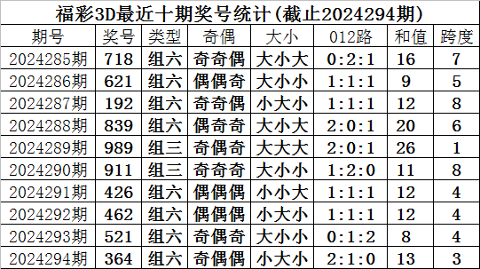 开奖回顾:福彩3D第2024294期奖号为364,奖号形态为:组六、小大小、2:1:0、奇偶偶。