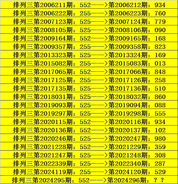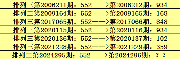 第2024295期排列三奖号为552,历史上该号码直选出现7次,下期奖号分别为:934、168、848、934、102、359。