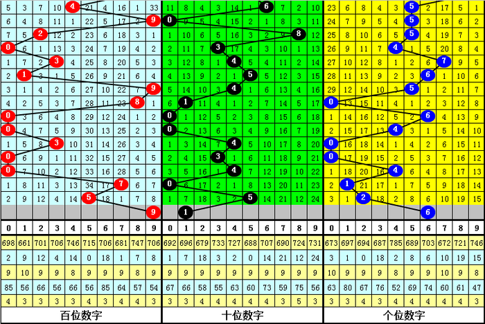 百位:大小比为3:3,奇偶比为5:1,本期参考号码9。