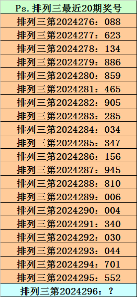 第2024295期排列三奖号为552,历史上该号码组选开出22次,下期奖号分别为:934、760、779、090、168、823、169、013、848、258、510、860、088、555、934、102、980、359、308、287、529。