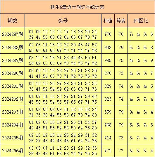 快乐8第2024296期奖号开出:03 05 07 11 12 20 21 29 32 33 35 43 45 51 56 58 74 77 79 80,其中奖号和值为771,跨度为77,四区比为6:5:5:4。