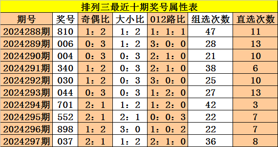 上期回顾:体彩排列三第2024297期奖号:037,奇偶比2:1,大小比1:2,012比2:1:0。