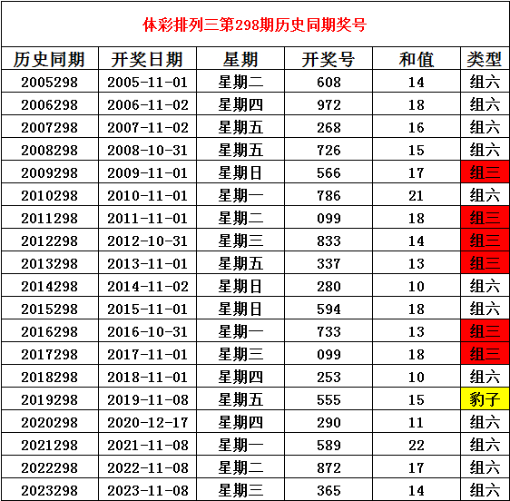 2024年11月7日排列三第298期开奖,历史同期分别开出奖号:
