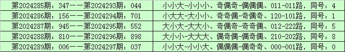 则,排列三第2024290期奖号:004,与排列三第2024298期奖号可能有相同的号码。且排列三第2024298期奖号大小比、奇偶比和012路比可以参考第2024290期奖号形态:小小小、偶偶偶和001路。