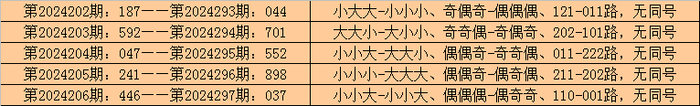 在排列三历史开奖中,第2024202期-第2024206期连续5期奖号为:187-592-047-241-446。