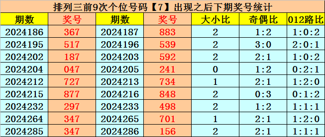 个位号码:上期奖号为大号、奇数、1路号码:7,历史上个位号码7共开出673期,前一次出现在第2024285期,上期遗漏11期再出。