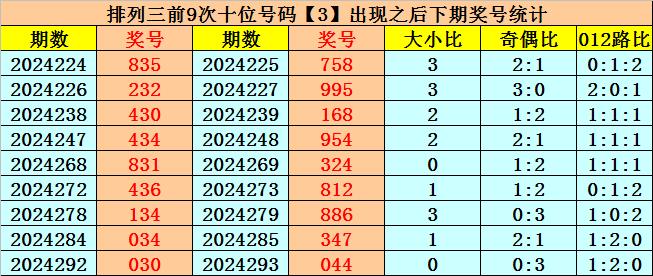 在十位前9次出现号码3后,其下期奖号分别开出:5-9-6-5-2-1-8-4-4,其中奖号个数012路比是2:3:4,奇偶比是4:5,大小比是5:4。