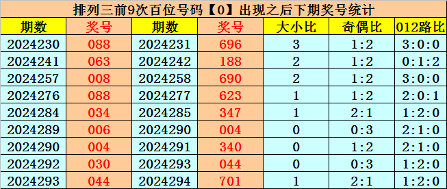 百位号码:百位上期奖号为0路、奇数、大号:0,历史上百位号码0共开出699期,前一次开出期数在第2024293期,上期奖号隔3期再次开出。