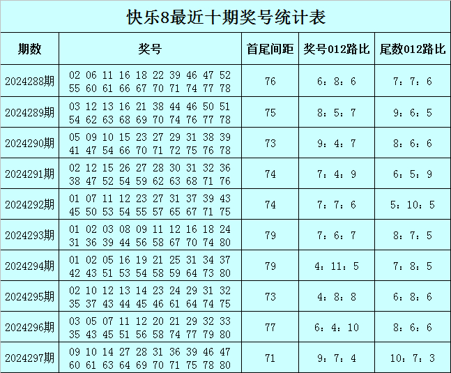福彩快乐8第2024297期开出奖号:09 10 14 27 28 31 36 39 46 47 60 61 63 64 69 70 71 75 78 80,其中奖号012路比为9:7:4,尾数012路比为10:7:3。