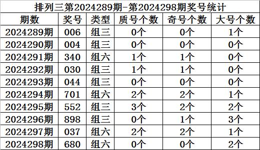 上期回顾:排列三第2024298期开奖:680,质合比为0:3,奇偶比为2:1,大小比为0:3。