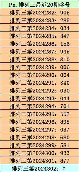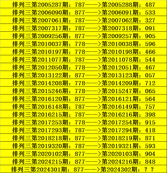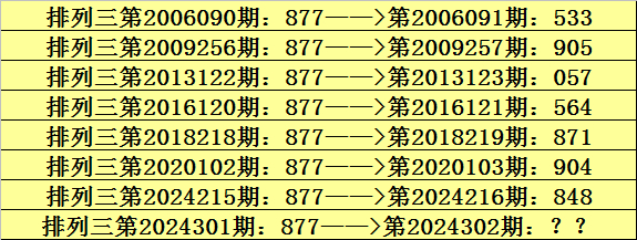 第2024301期排列三奖号为877,历史上该号码直选出现8次,下期奖号分别为:533、905、057、564、871、904、848。