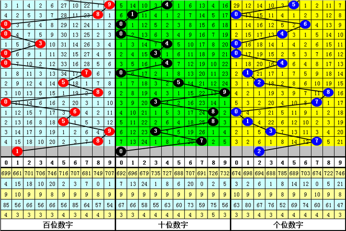 百位:当前遗漏最大的号码为4,遗漏20期,历史上该号最大遗漏为66期,本期百位继续排除号码4。