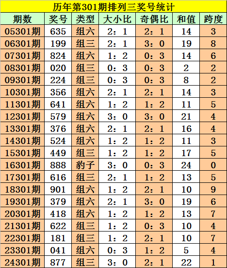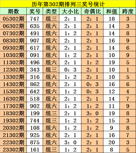 历年第302期奖号中:组三开出5次,组六开出14次。组三较少,本期注意组三反弹。