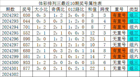 体彩排列三最近10期分别开出奖号:030、044、701、552、898、037、680、581、933、877,各奖号属性详见下表: