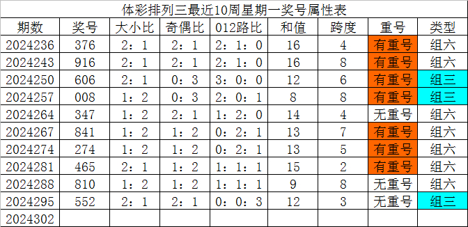 体彩排列三最近10周星期一奖号分别为:376、916、606、008、347、841、274、465、810、552,各奖号属性详见下表: