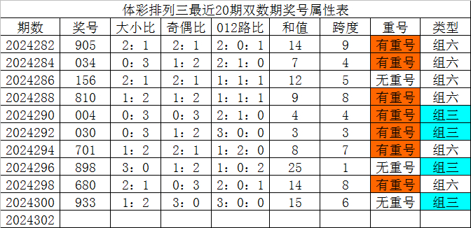 体彩排列三最近20期双数期奖号分别为:905、034、156、810、004、030、701、898、680、933,各期奖号详细属性下表: