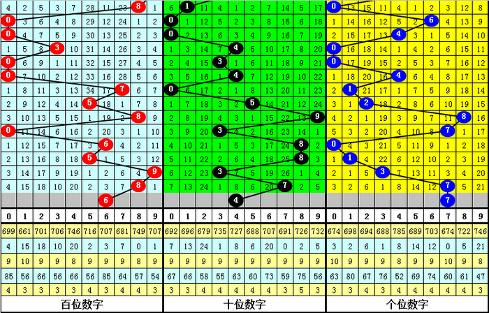 其中,号码0-9开出次数分别为:号码0开出4次、1开出3次、2开出2次、3开出2次、4开出4次、5开出3次、6开出5次、7开出3次、8开出3次、9开出1次。