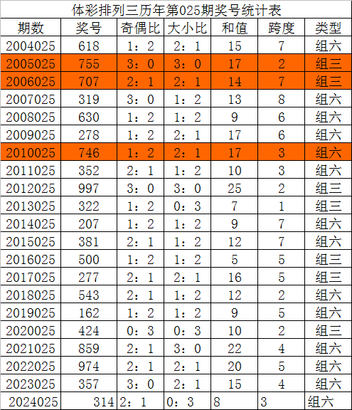 排列三第2024025期奖号为314,奇偶比为2:1,大小比为0:3,和值为8,跨度为3。