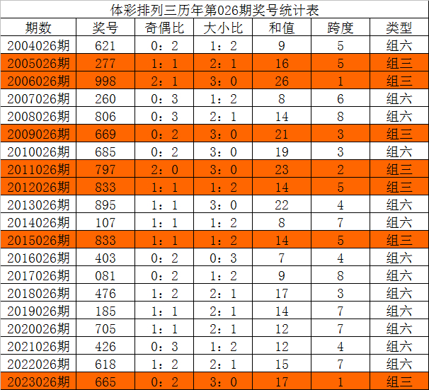 在历年排列三第026期开奖中:组三号码出现7次,组六号码出现13次。组三、组六号码出现比例持平,本期奖号形态关注:组六号码。