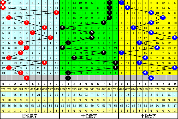 3、在以上0-9号码频次中,号码大小比为34:29,012路比为24:23:16,本期预计百位开出1路号码,参考号码4。