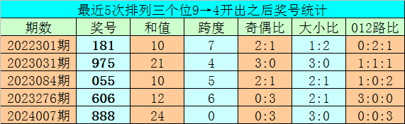 1、排列三前两期个位分别开出号码9和4,历史上个位号码连续两期分别出现9和4时,共有86次。在最近5次出现时,其下期分别出现号码:181、975、055、606、888;