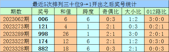 1、最近两期排列三十位号码开出号码分别为9和1,历史上十位号码连续两期同时出现号码9和1的奖号共开出75期。最近五次下期开出号码为:006、121、998、174、882;