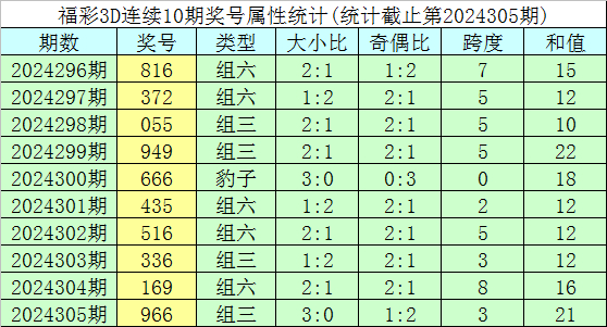 开奖回顾:福彩3D第2024305期奖号为966。奖号形态为组三,大小形态为大大大,奇偶形态为奇偶偶,和值为21,跨度为3。