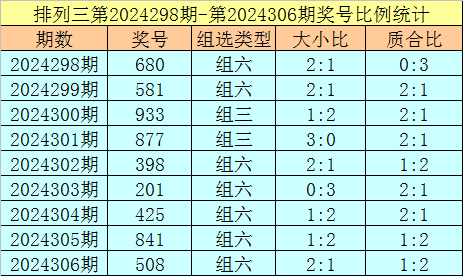 上期回顾:排列三第2024306奖号开出508,奖号质合比为1:2,大小比为2:1,跨度为8,类型为组六。