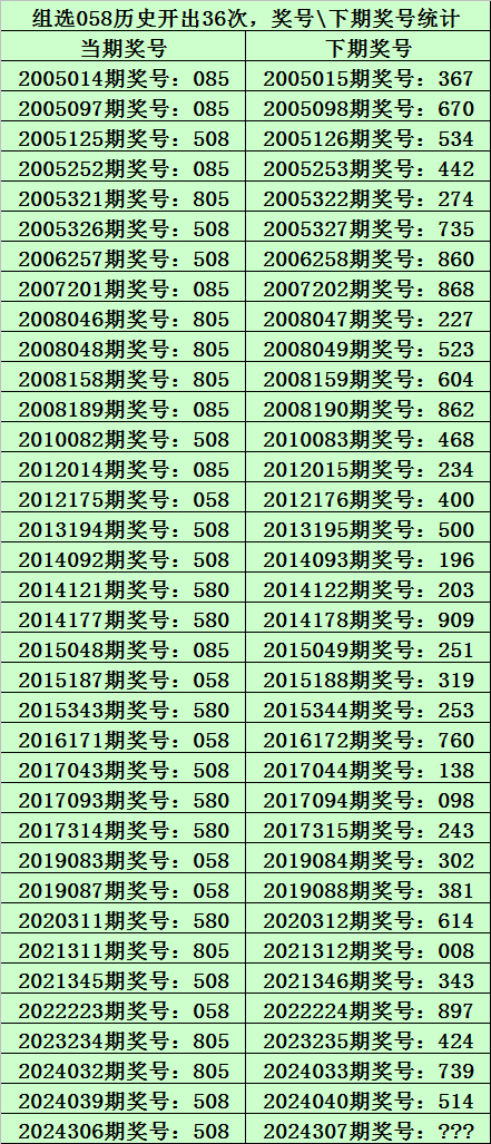 二、组选058分析:排列三历史上已开出36次组选号码058了,其奖号和下期开出奖号统计如下: