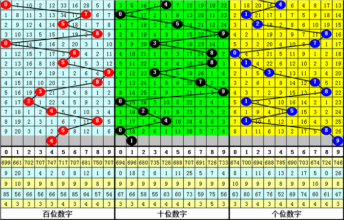 0路号码上期开出1个,近10期共出现11个走势相对较冷,其中0开出4个、3开出4个、6开出1个、9开出2个,本期应注意0路号码回补,参考号码9。