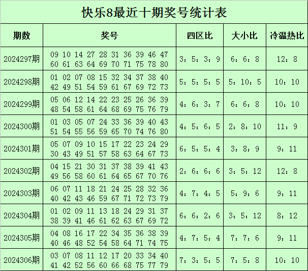福彩快乐8第2024306期开奖回顾:03 07 08 11 12 17 20 33 34 40 41 42 52 56 60 66 68 75 77 79,其中奖号四区比为7:3:5:5,冷温热码比为7:5:8,大小比为10:10,和值为801,同尾号码为20 40 60、11 41、12 42 52、03 33、56 66、07 17 77、08 68。