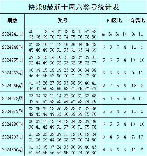 福彩快乐8第2024300期(上周六)开奖回顾:01 03 05 07 24 33 36 39 40 43 51 54 55 56 59 65 70 74 76 80,其中奖号四区比为4:5:6:5,奇偶比为11:9。