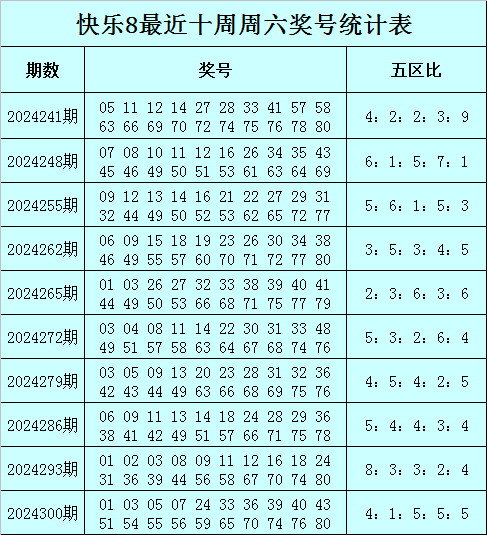 福彩快乐8第2024300期(上周六)开奖回顾:01 03 05 07 24 33 36 39 40 43 51 54 55 56 59 65 70 74 76 80,其中奖号五区比为4:1:5:5:5。