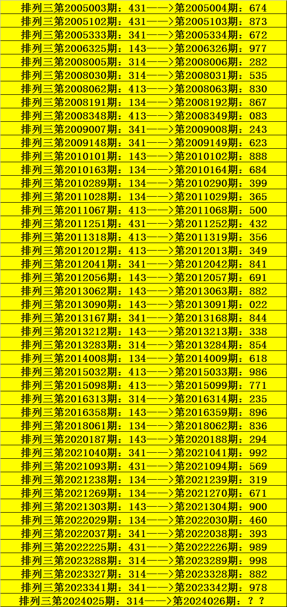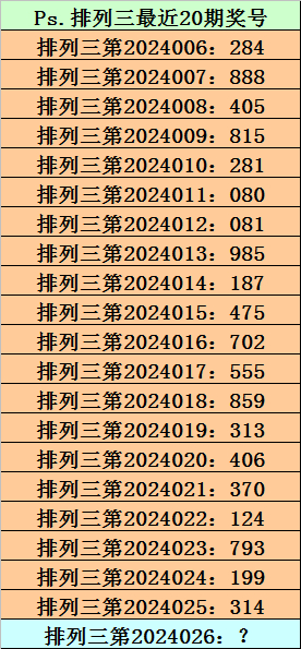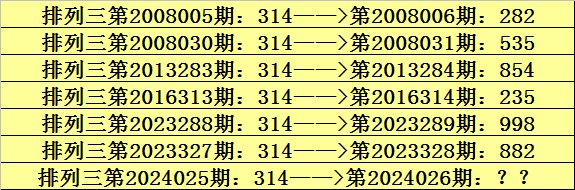 第2024025期排列三奖号为314,历史上该号码直选出现7次,下期奖号分别为:282、535、854、235、998、882。