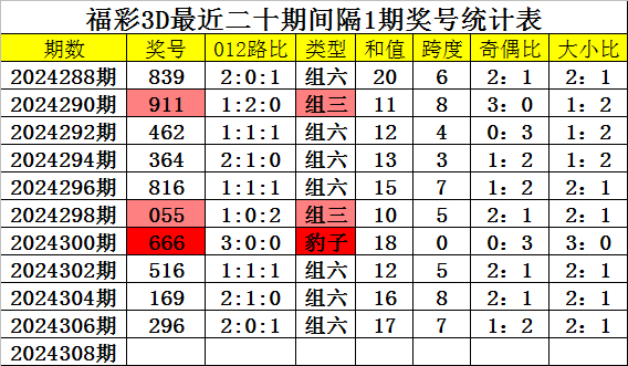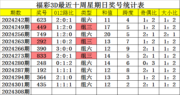 奖号类型分析:从近期周日开奖数据分析,组六近期热出,十周内出现7次,上周日为组六号码,组三出现3次,表现相对较冷,本周日预计继续开出组六号码。