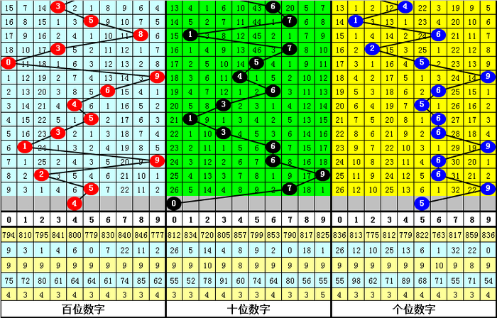 跨度分析:最近周日跨度出现范围在2-9区间,跨度比较集中,上周日跨度为2,跨度下降1个点位,本期看好跨度上升,参考跨度5。
