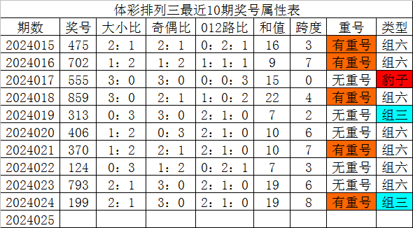 体彩排列三最近10期分别开出奖号:475、702、555、859、313、406、370、124、793、199,各奖号属性详见下表:
