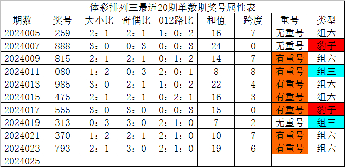 体彩排列三最近20期单数期奖号分别为:259、888、815、080、985、475、555、313、370、793,各期奖号详细属性下表: