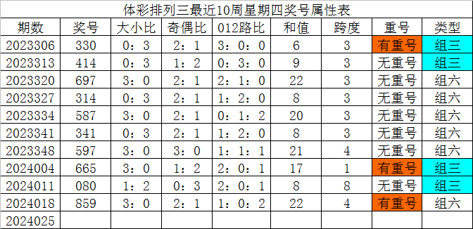 体彩排列三最近10周星期四奖号分别为:330、414、697、314、587、341、597、665、080、859,各奖号属性详见下表: