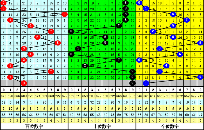 其中,号码0-9开出次数分别为:号码0开出3次、1开出2次、2开出1次、3开出4次、4开出1次、5开出7次、6开出0次、7开出3次、8开出6次、9开出3次。