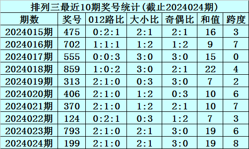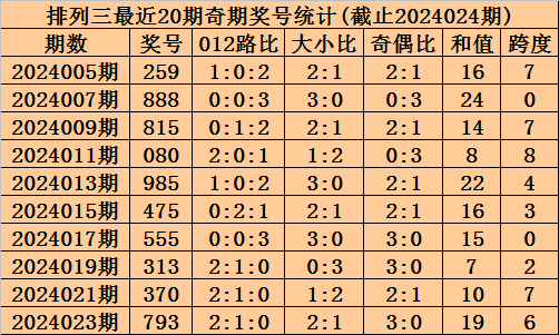 上期回顾:排列三2024024期奖号为199,奇偶比为3:0,大小比为2:1,跨度为19。
