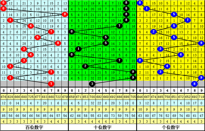 上期第二位奖号为:9,开出重号,表现相对热,前10期该位冷码表现低迷,本期注意该位冷码逐渐解冻,关注号码3。