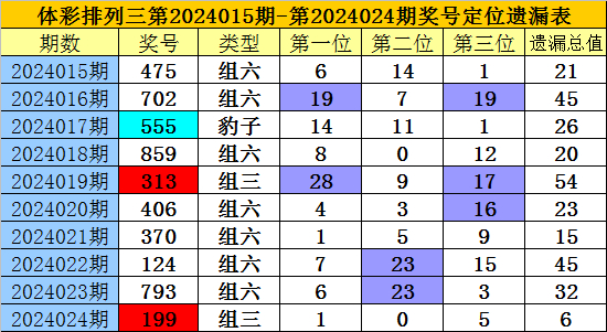 开奖回顾:排列三第2024024期奖号为:199,各位号码遗漏值分别为1、0、5,遗漏总值为6。