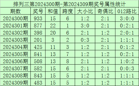 上期回顾:排列三第2024309期开奖号:483,奖号和值:15,奇偶比1:2,大小比1:2。