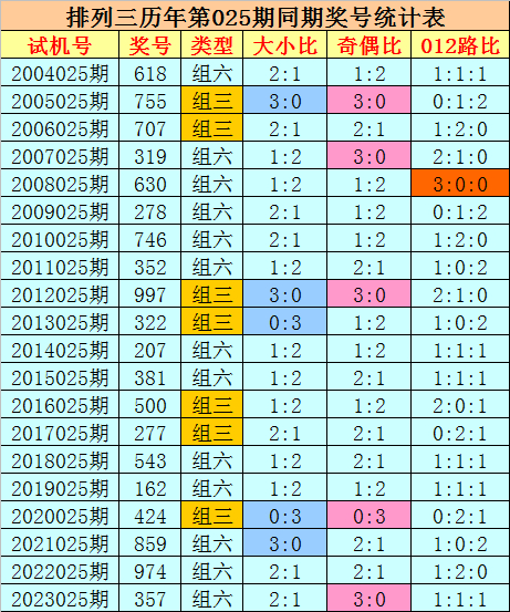 组选类型推荐:历史上排列三第025期同期奖号中,组六出现13期,组三出现7次,今年第025期预计奖号为组六号码。